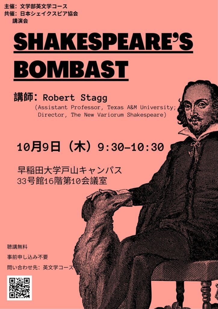 早稲田大学英文学コースの主催で、講演会 Shakespeare's Bombastを開催します。講師はRobert Stagg先生です。詳細は以下の通りです。